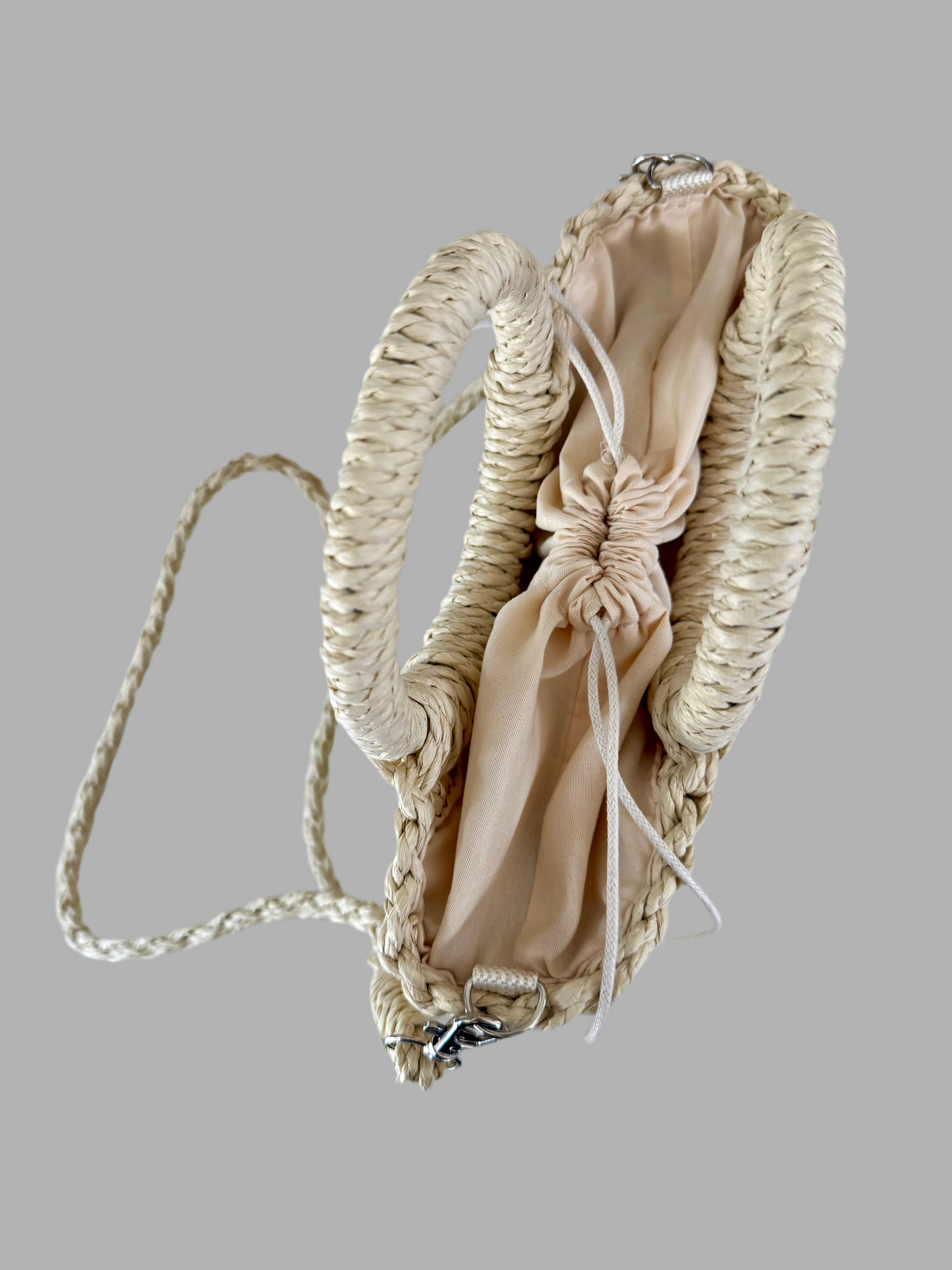 Beige straw woven bucket bag studded with starfish charms, shells and pearls. The bag’s shape is both practical and chic, with a drawstring pouch to secure your belongings and a detachable chain perfect for wearing cross body.